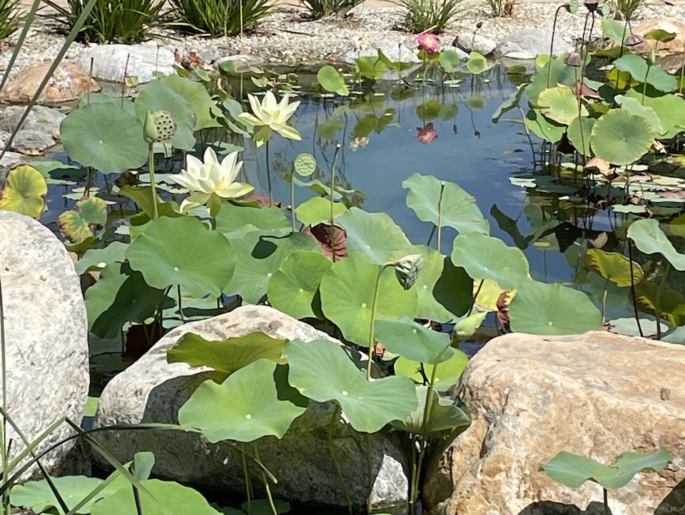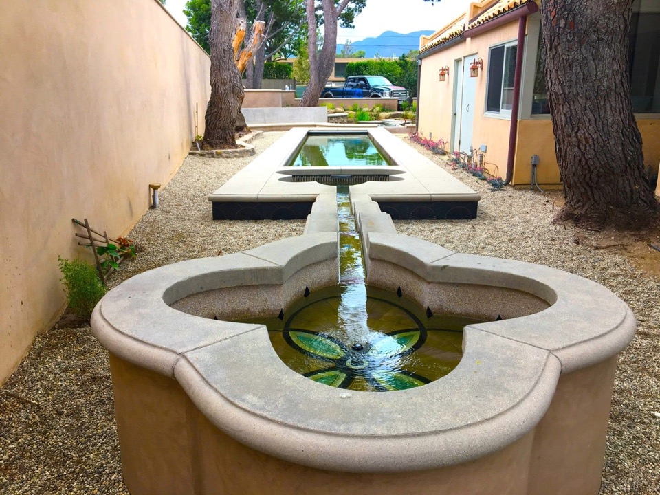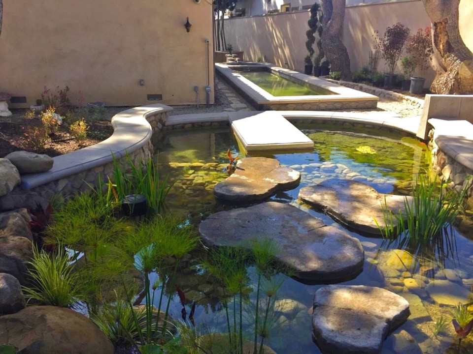 The Regeneration Zone is a separate reflecting pond terraced to blend into the dry landscape. The design also incorporates stepping stones and a walkway to provide up close viewing of the water garden. The entire project is surrounded by custom walls for privacy and enticing built-in seating areas.