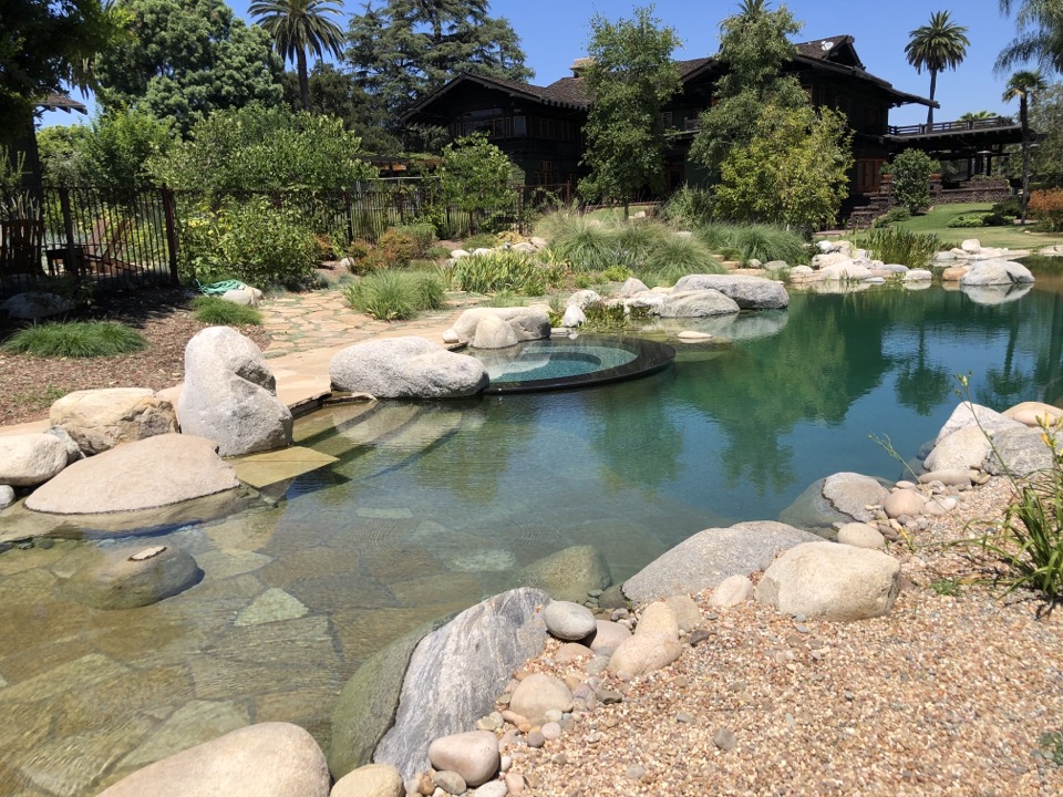 The design incorporates features that were present in the historic lake such as the colossal boulders sourced from Southwest Boulder of Fallbrook, CA. We also recreated an area to allow for the reflection of the house.  The large NSP begins with a gently sloped “beach” entry and culminates with a beautiful Lotus area and a feature unique to this pool. The client wanted the ability to swim among the beautiful floating Lotus and Waterlilies so our very cleaver builder, Troy Becker, customized a swim channel as the perfect solution to the request. The clients can enjoy the beautiful plants, crystal clear water and the lovely sound of a nearby creek flowing into the lake from inside the pool and out. A separate spa was incorporated into the design and finished in a vibrant colored tile with a dark edge to both standout and blend with the lake’s overall design.